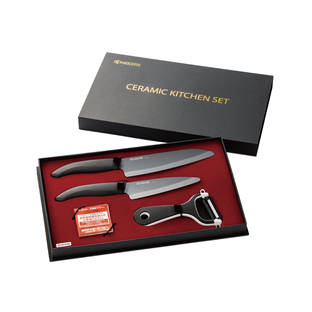 ピーラーの3点セット。高級感のある化粧箱入りです。商品名 セラミックナイフ 三徳17cm