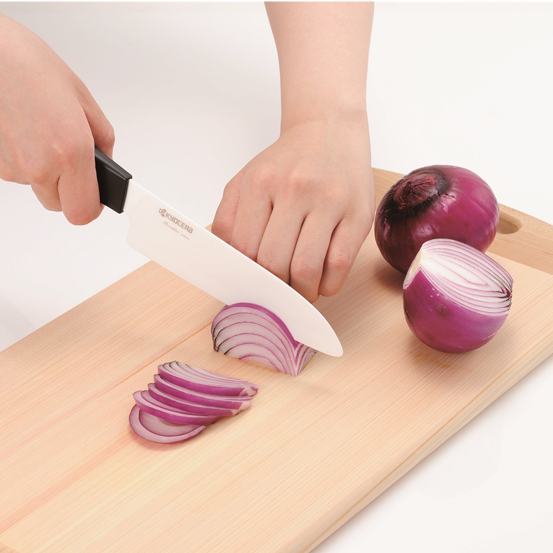 ●ファインセラミックスからは金属イオンが出ないので、リンゴやレタスを切っても切り口が変色しにくく、キレイに仕上げることができます。